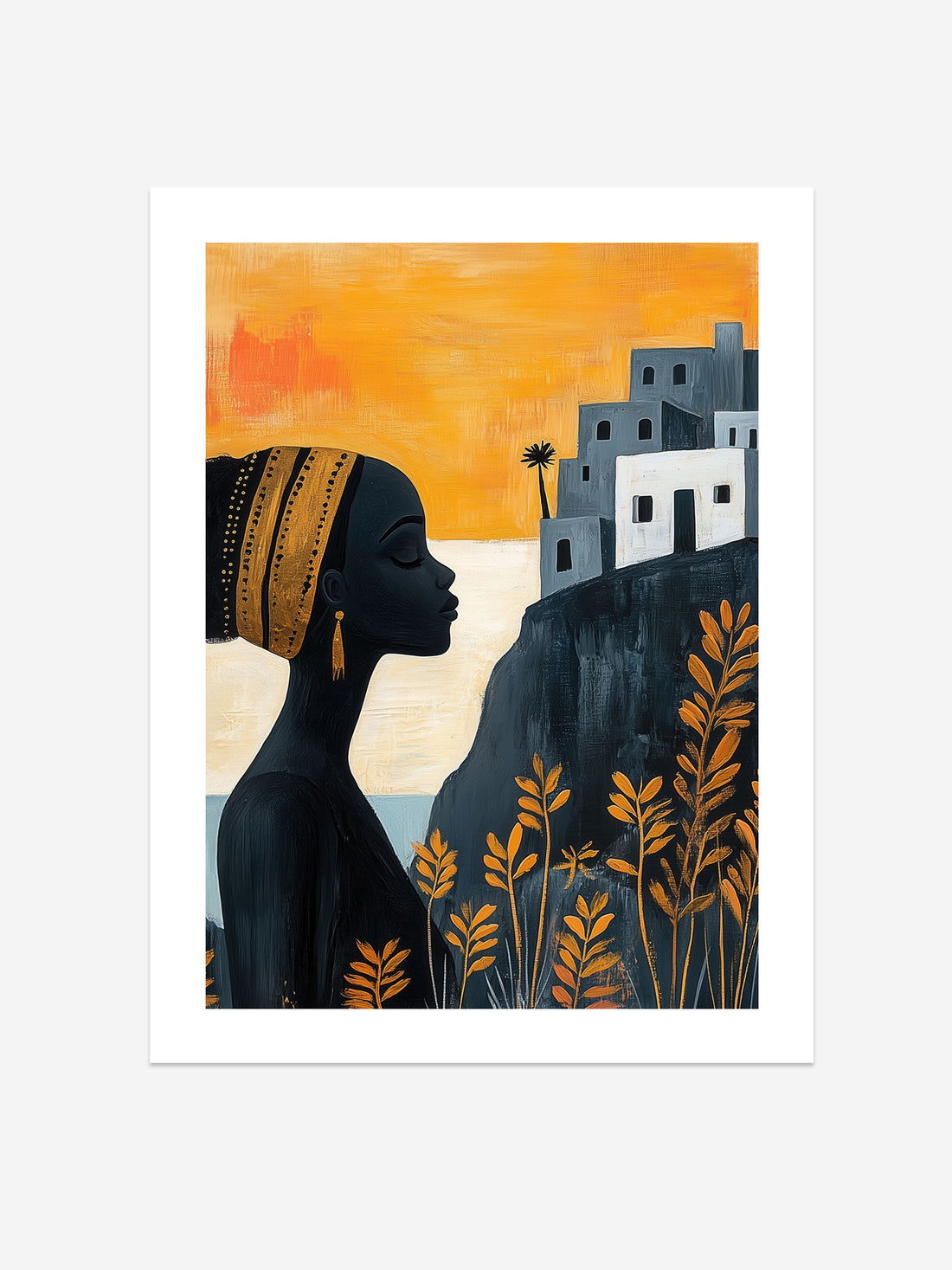 Golden Sun African Woman Art Print This captivating art print features a serene African woman...