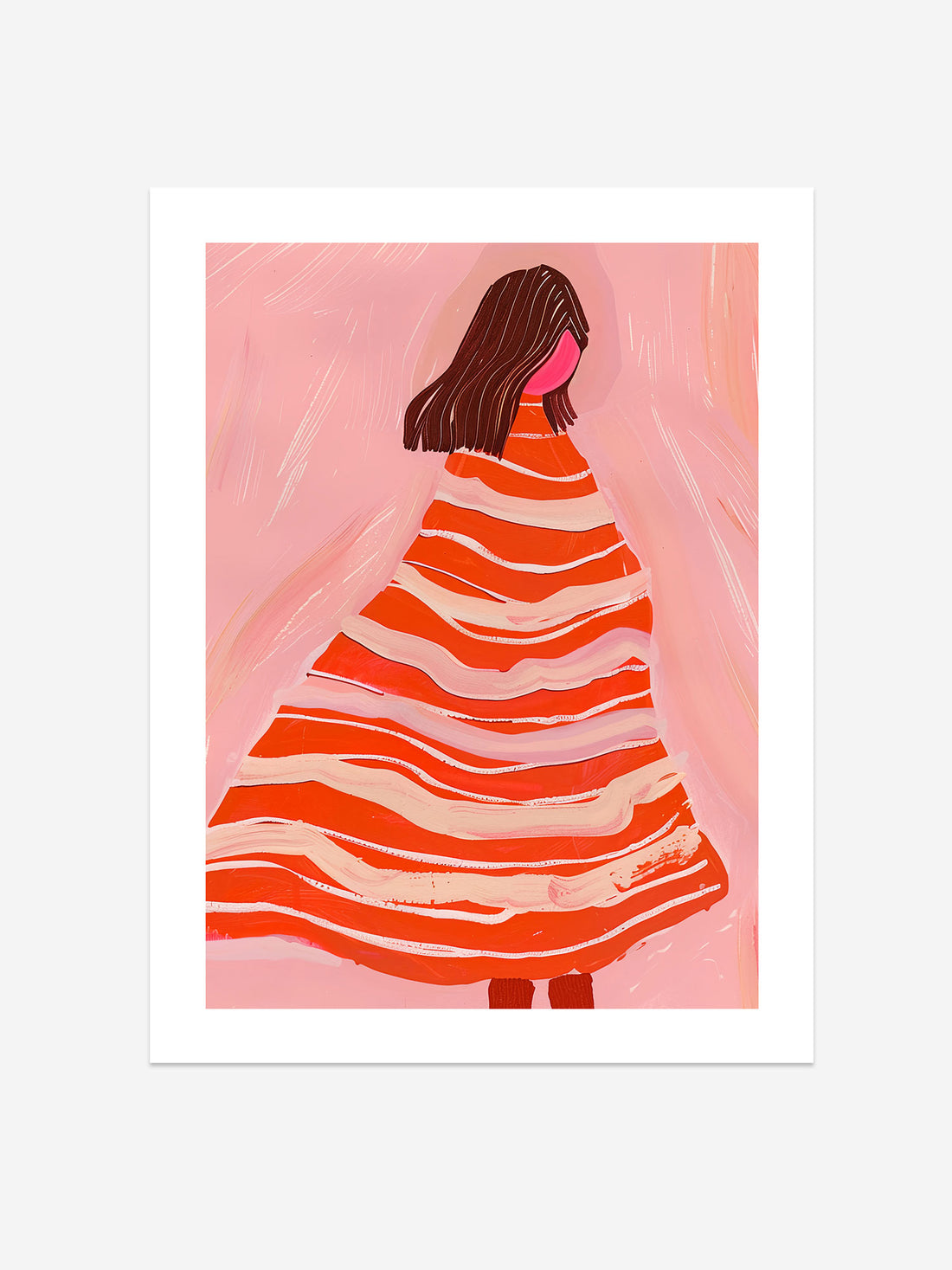 Abstract Portrait Art Print – Woman in Striped Dress on Pink Background