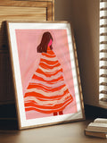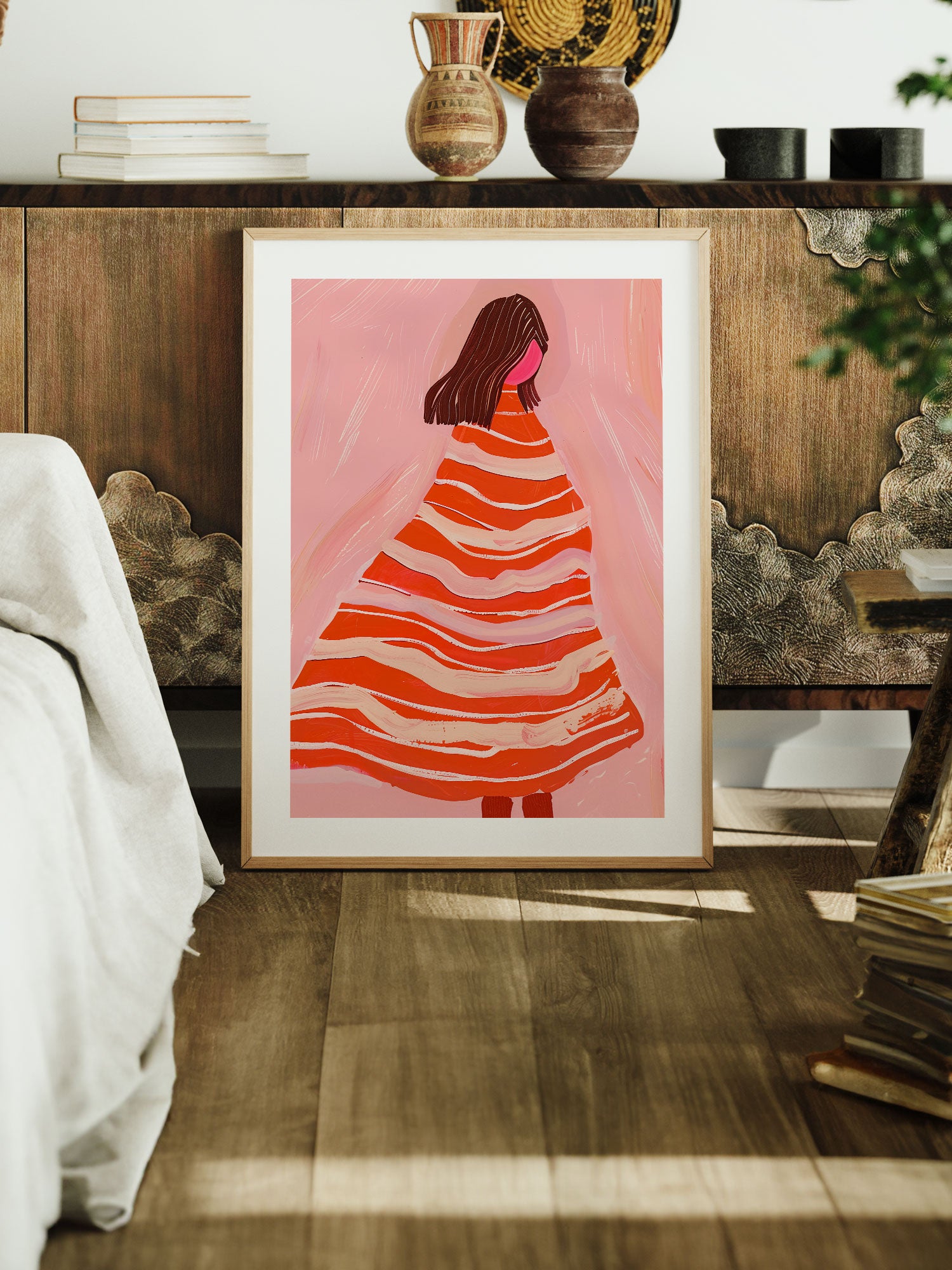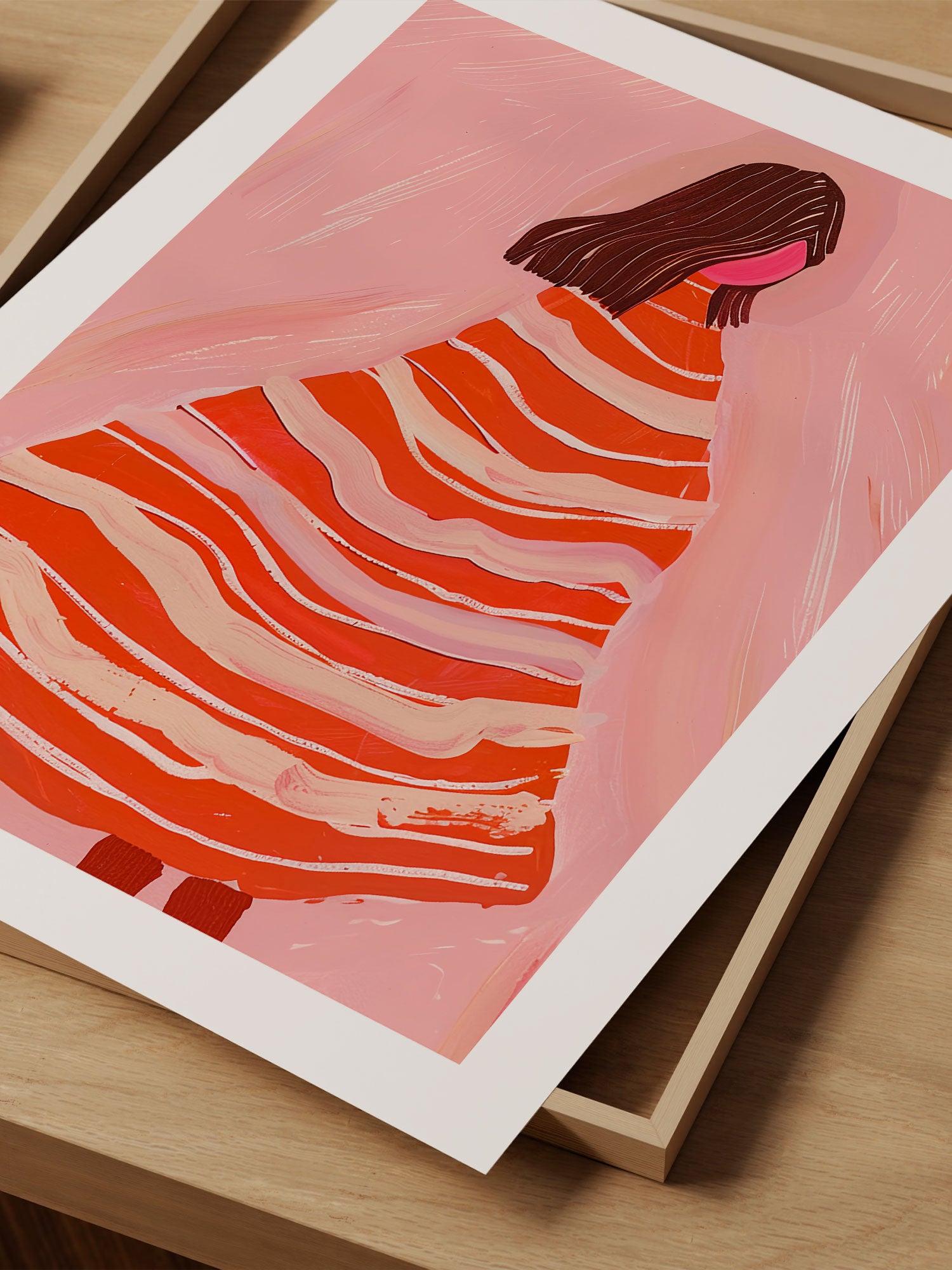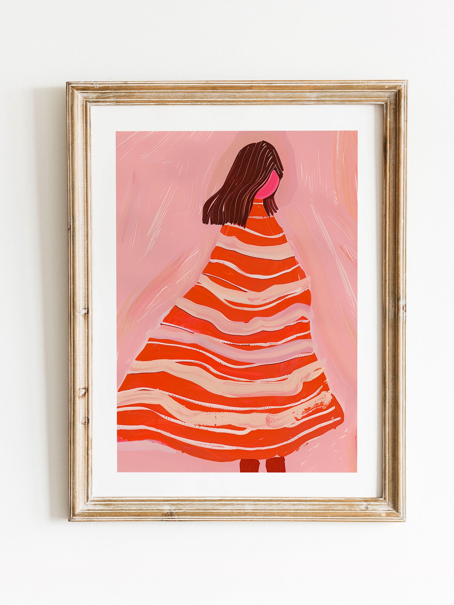 Abstract Portrait Art Print – Woman in Striped Dress on Pink Background