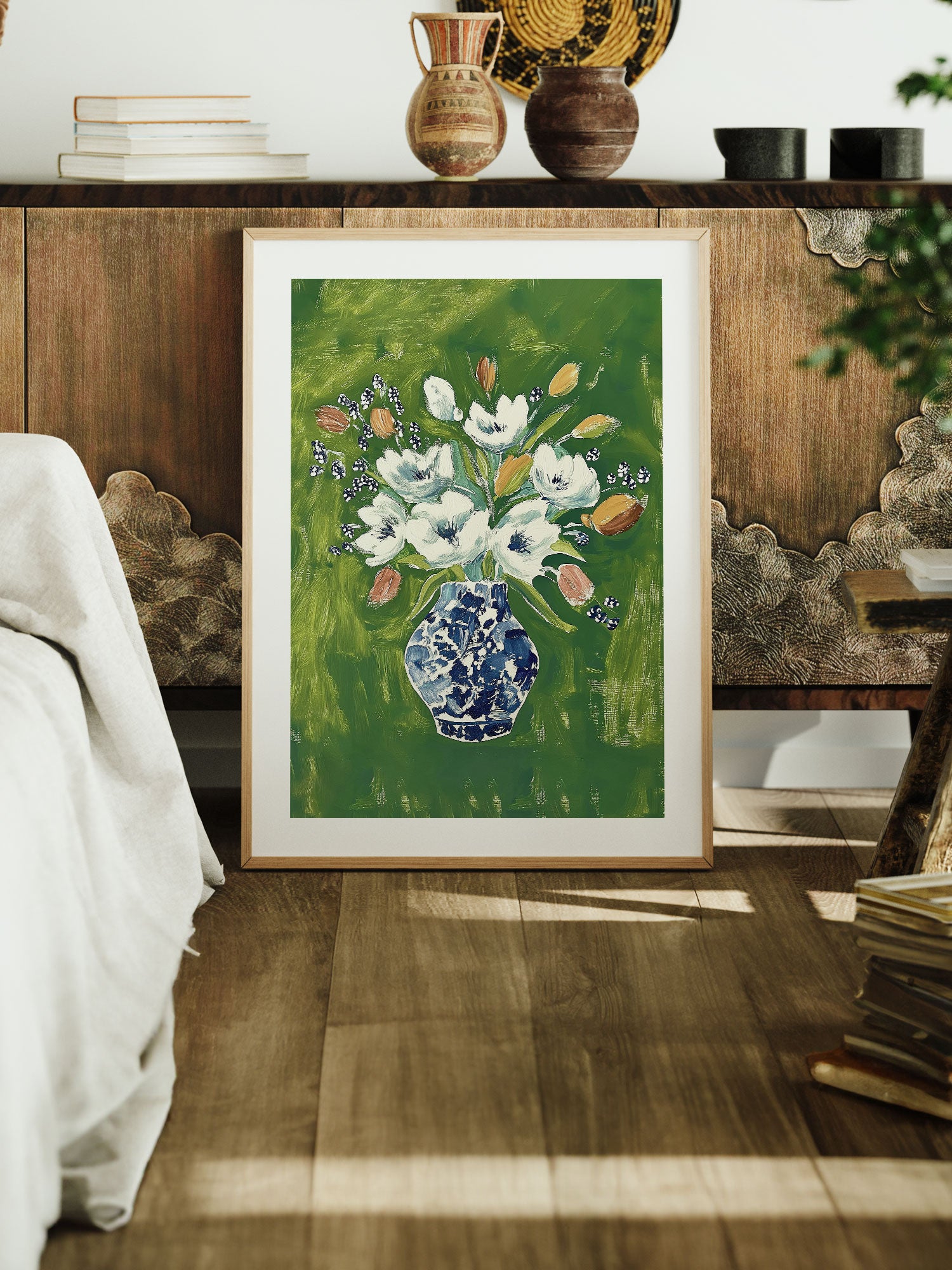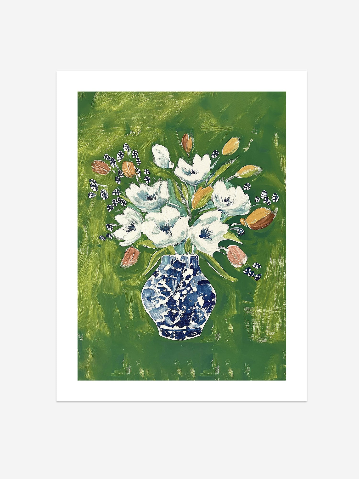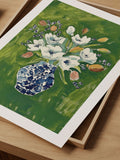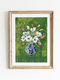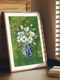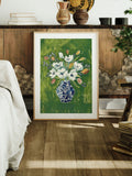Classic Floral Art Print – White Blooms in Blue Vase on Green Background