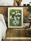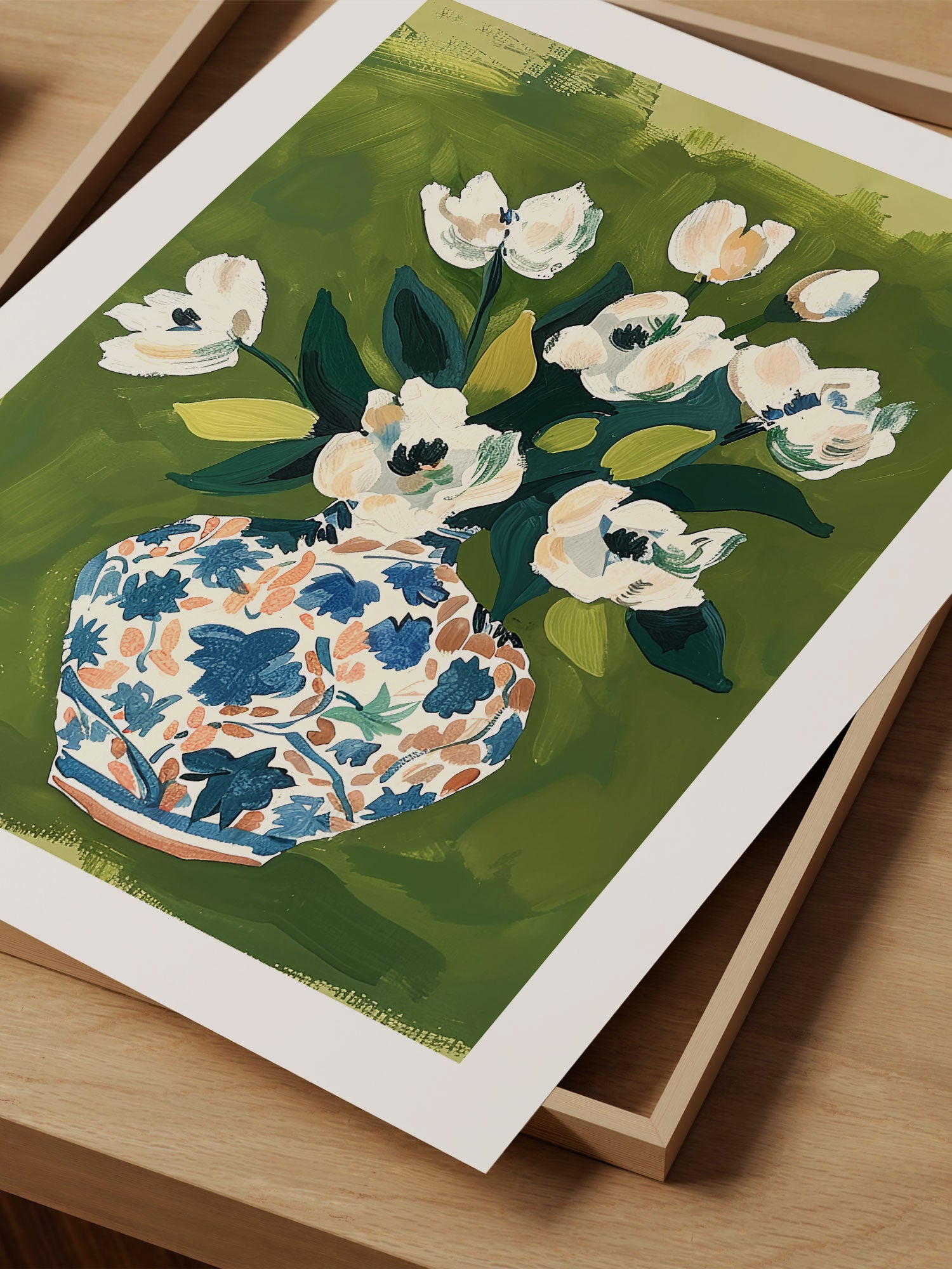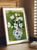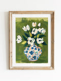 Floral Vase Art Print – Tulips in Patterned Vase on Green Background
