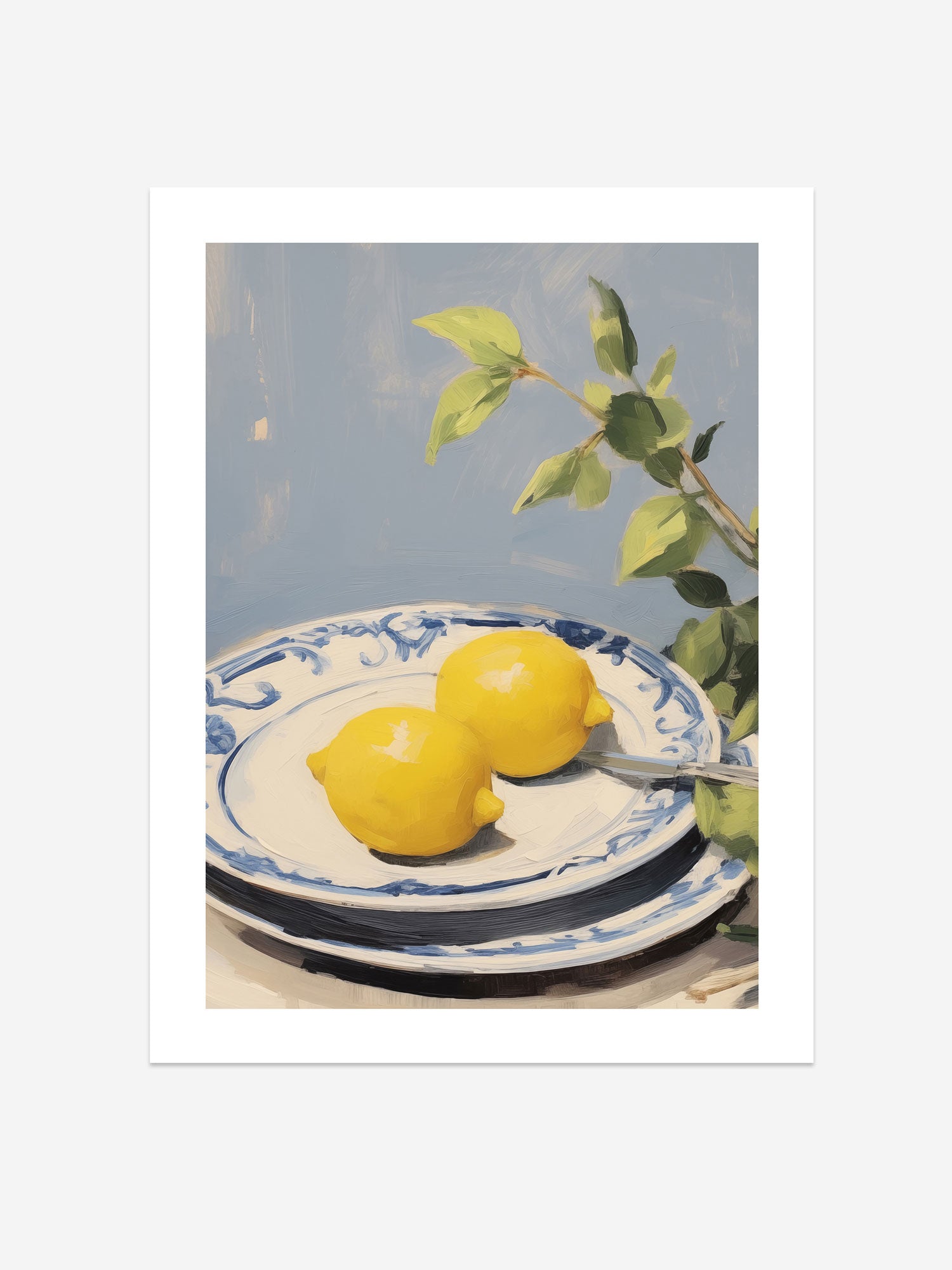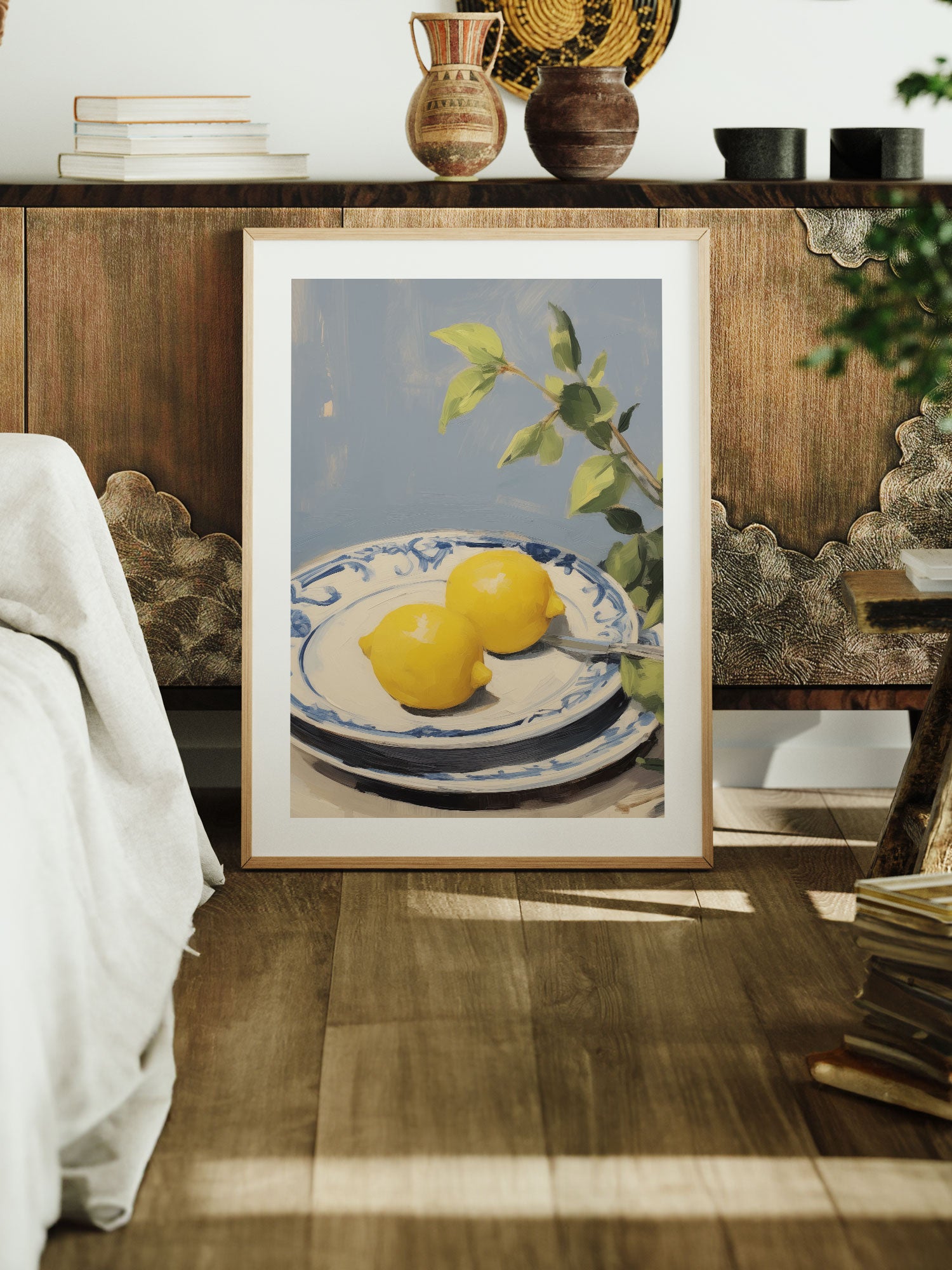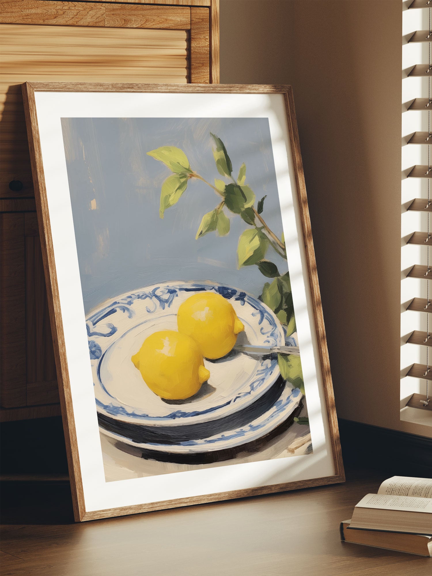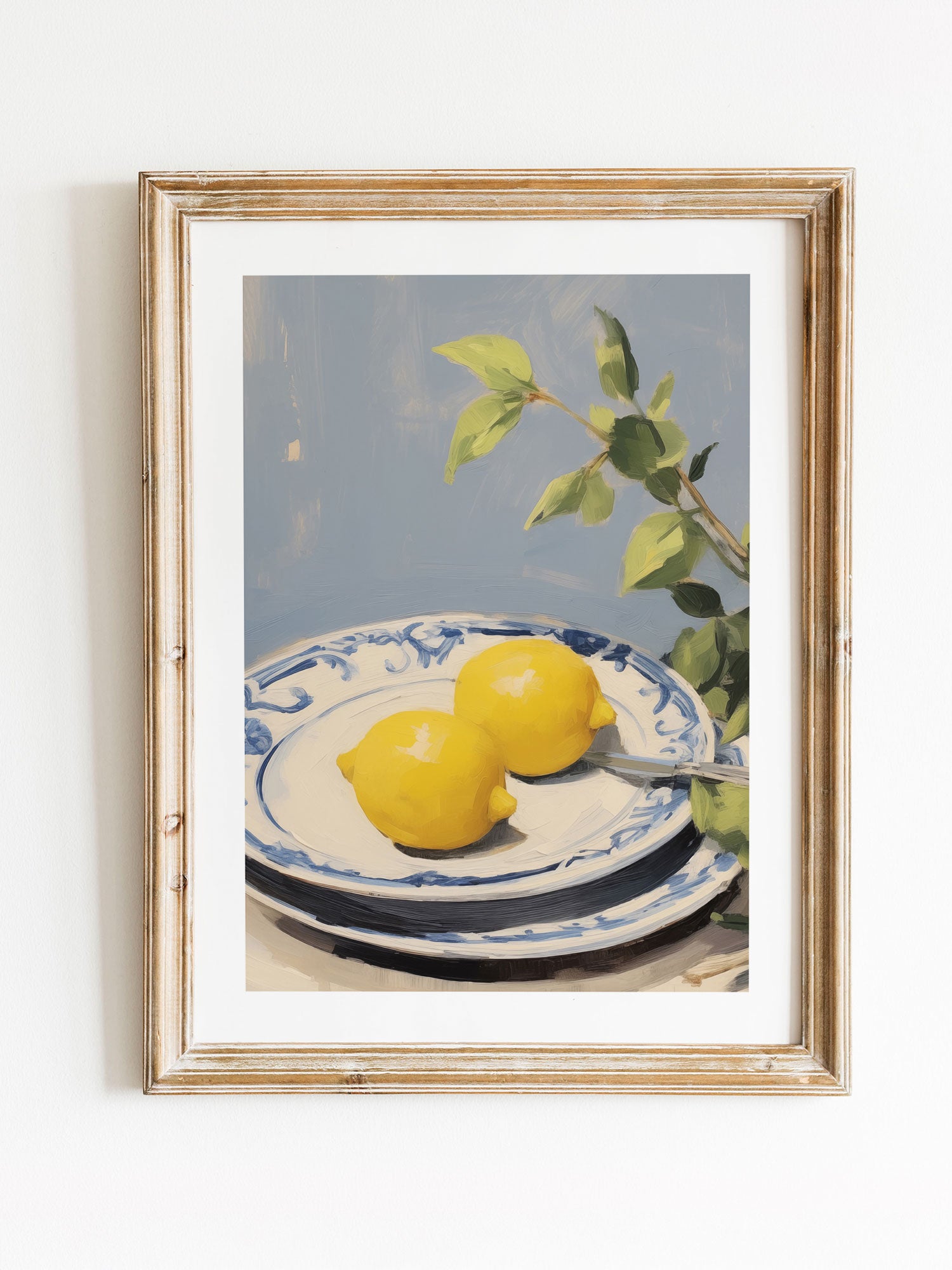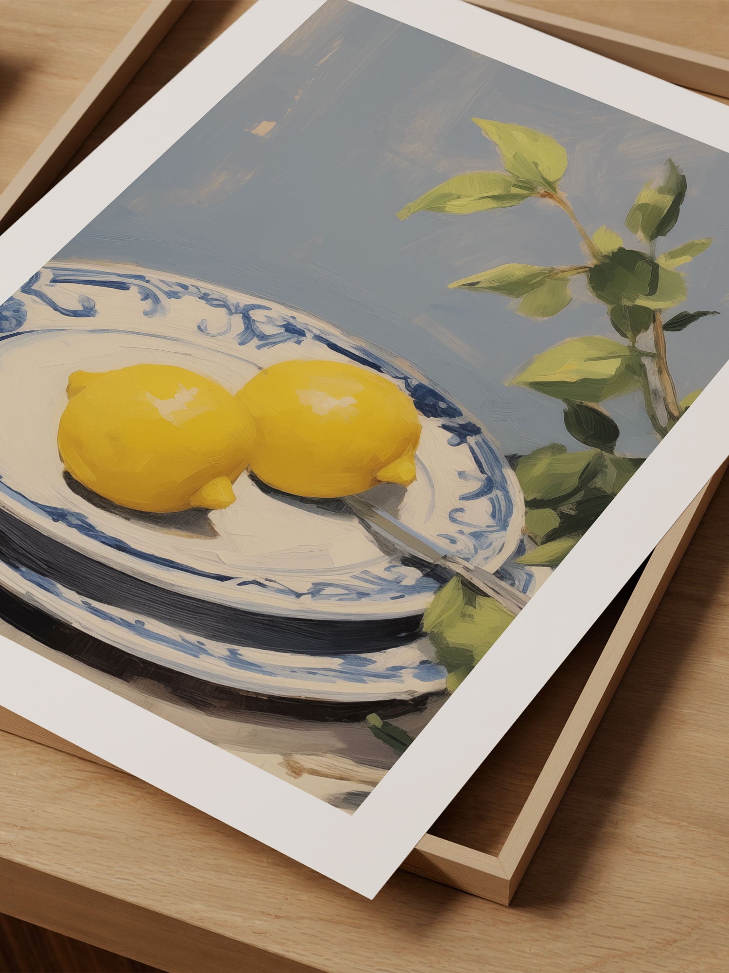 Lemons on Blue and White Plates Art Print – Classic Kitchen Decor